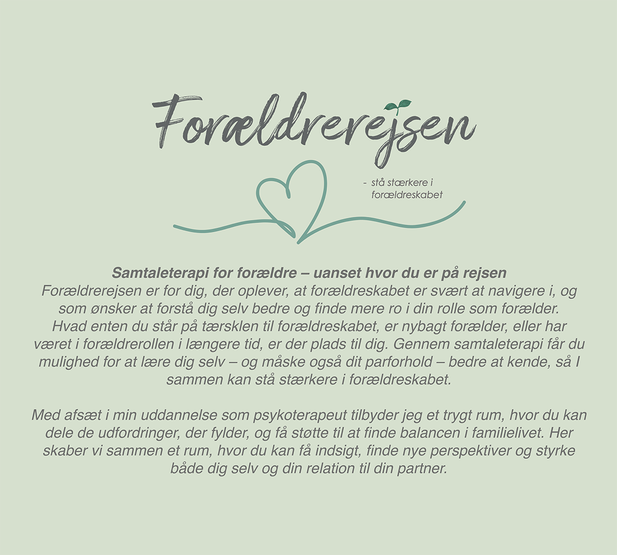 Hos mig finder du et trygt, ikke dømmende rum, til at dele det, der fylder. Et sted, hvor du kan få støtte til at forstå dig selv og dine reaktioner – og finde mere ro, kontakt og nærvær i dit forældreskab.
