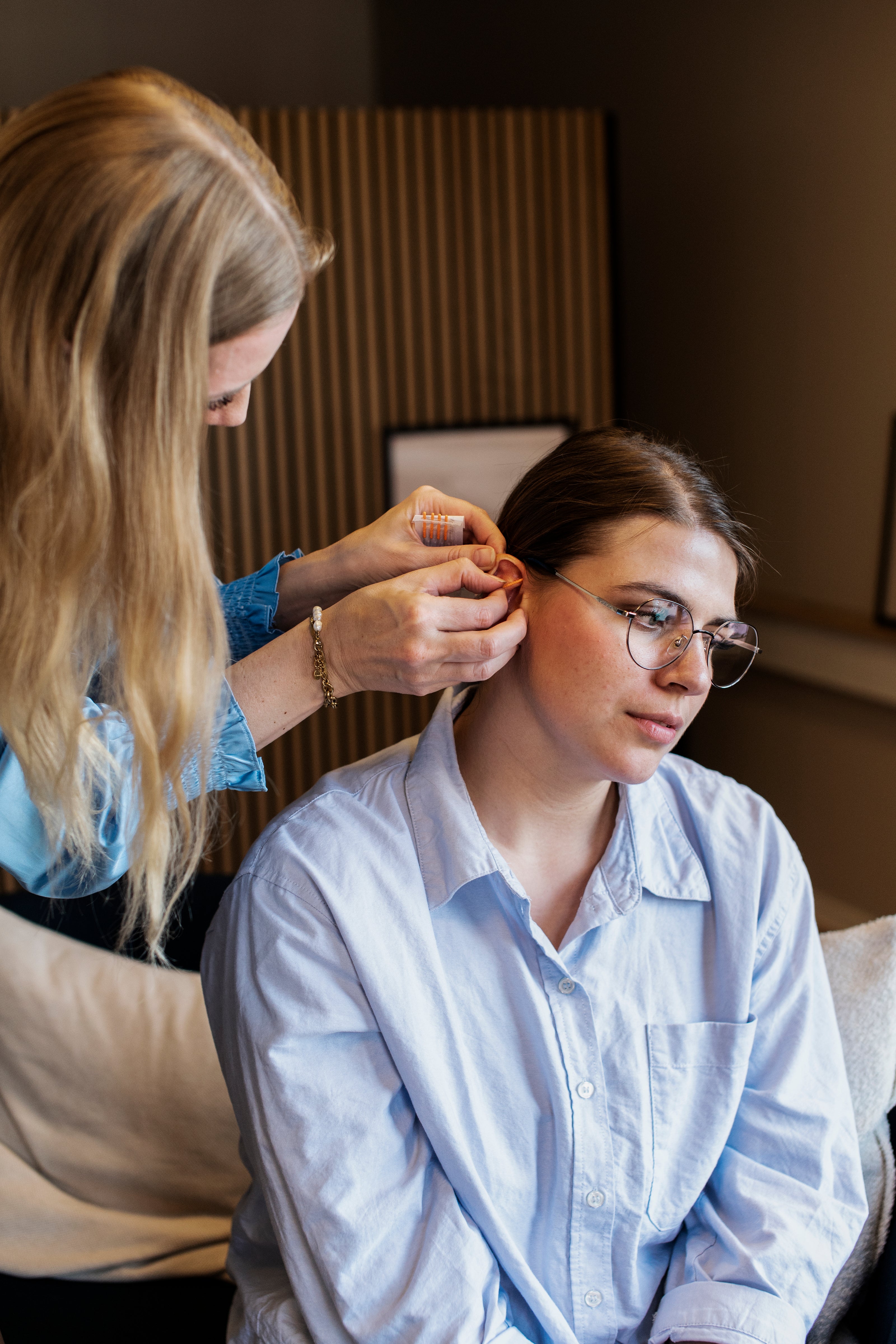 Nålene er ikke permanente nåle, men engangsnåle og kasseres efter brug. Nålene skal sidde i ørene i 45 min. Efter nålene er placeret sættes mindfulness musik på, og du efterlades til sessionen er slut.